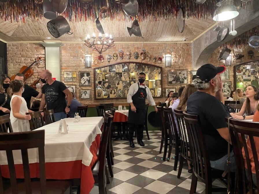 Tem música ao vivo com as mais tradicionais cantigas italianas e os músicos vão de mesa em mesa. Ah, não se assuste ou ache estranho caso venjam bandejas serem jogadas no chão..
