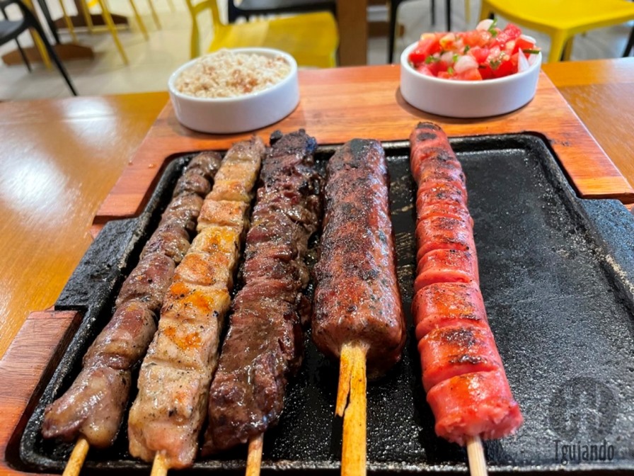 além dos espetinhos para comer ali, tem para fazer em casa, além de outros pratos oara refeição, todos com espetinho.