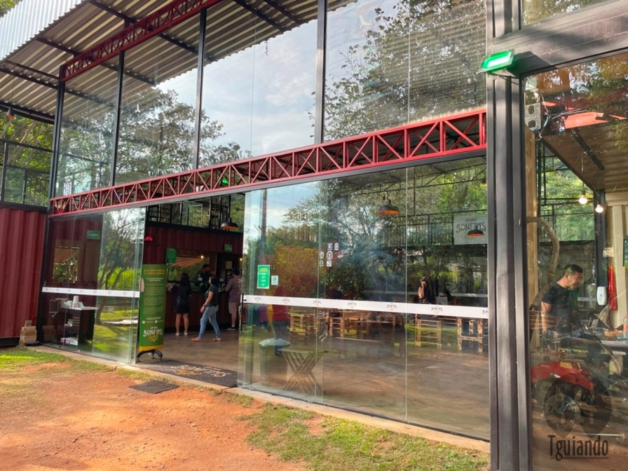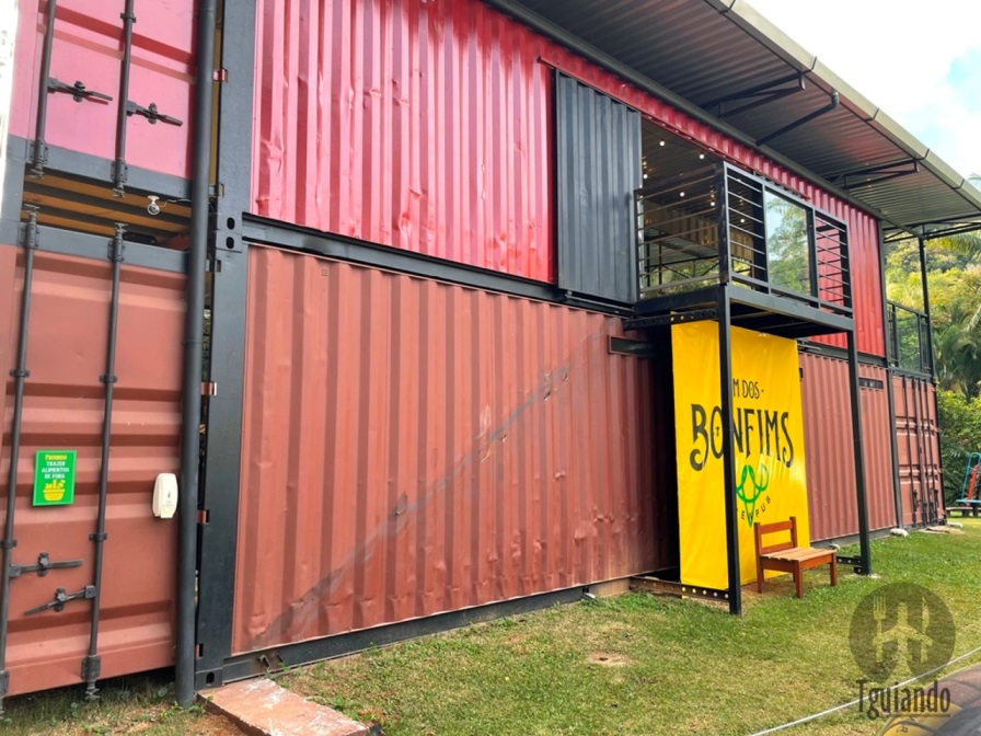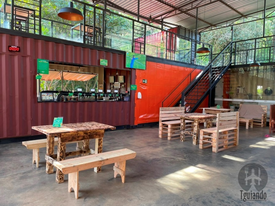 Alguns contêineres formam a área interna, onde fica a cozinha e bar com torneiras e algumas mesas e bancos e pallets. O lugar tem estilo de simples, mas é uma delícia, bem elaborado, com grandes janelas deixando bem arejado e aconchegante.