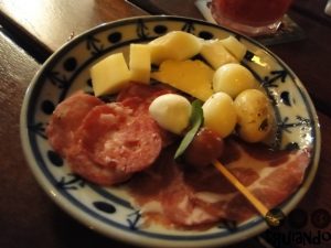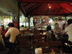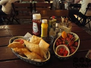Depois de descansarmos um pouco no hotel, fomos andando até encontrar um barzinho legal. Na Praça João Zelante, próxima à padaria que tomamos café da manhã, tem alguns barzinhos que colocam as mesas na calçada. Escolhemos o Café BotecoAté o pedido chegar à mesa, o garçom sugere os frios por quilo no self-service. Você escolhe aquilo que quer e na quantidade desejada. Pedimos uma porção de linguiça artesanal (com farofa e vinagrete), R$ 26, e uma porção de pastel misto, R$ 19. De sobremesa: taça de banana caramelizada, R$ 16,95.