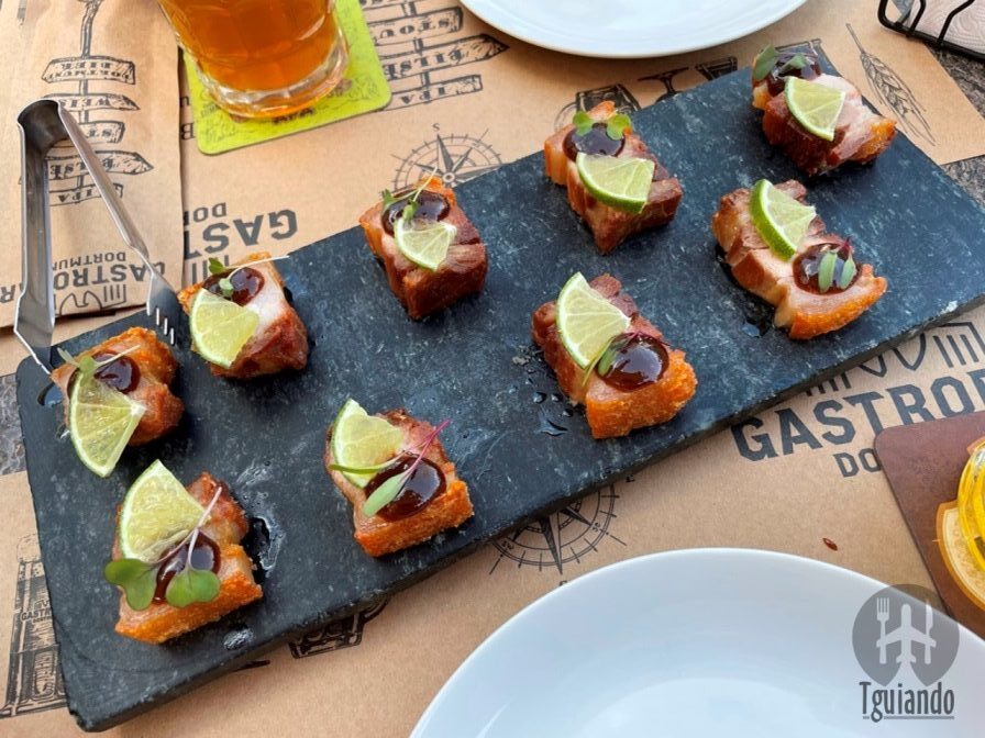 Foi difícil escolher, mas pedimos umas entradas para acompanhar o chopp: bolinho de queijo canastra (03 unidades de delicioso bolinho de queijo canastra frito com barbecue de goiabada), R$ 15, e barriga de porco (barriga suína cozida lentamente no sous vide, frita e finalizada com barbecue de goiabada e carpaccio de limão), R$ 32,90.