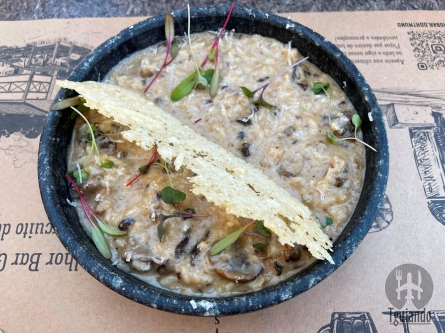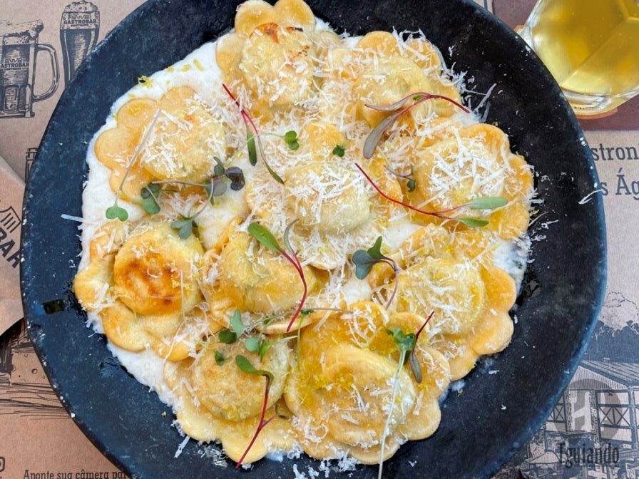 Os pratos principais: fiorella de muçarela de búfala ao molho de limão siciliano (molho de limão siciliano e queijo tulha), R$ 62,90, e risoto nostradamus (risoto de filé mignon na cerveja Nostradamus (stout) com mix de cogumelos frescos e crispy de queijo tulha), R$ 78,90.