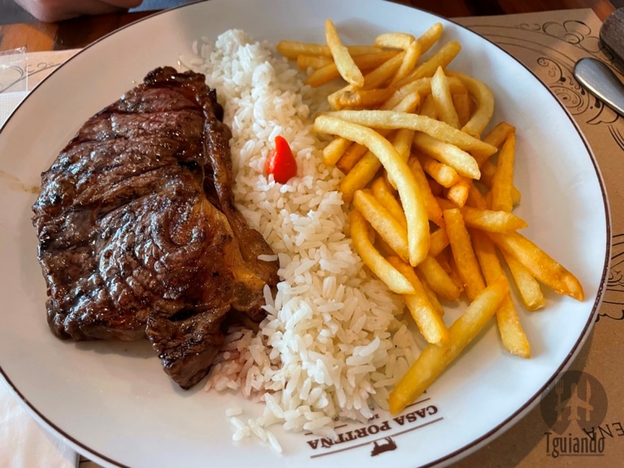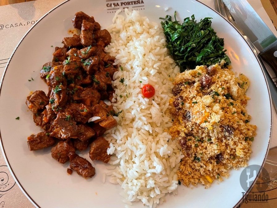 Fomos numa quinta-feira, umas 14h, e conseguimos pedir pelo menu executivo: picadinho de mingon (picadinho com arroz branco, feijão preto, farofa de ovos e couve), R$ 49, e bife de chorizo (bife de chorizo 200g com batata frita e arroz com brócolis), R$ 49.