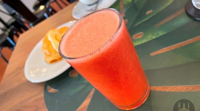 Começamos com as bebidas: capuccino, 13, suco de morango com laranja, R$ 15.