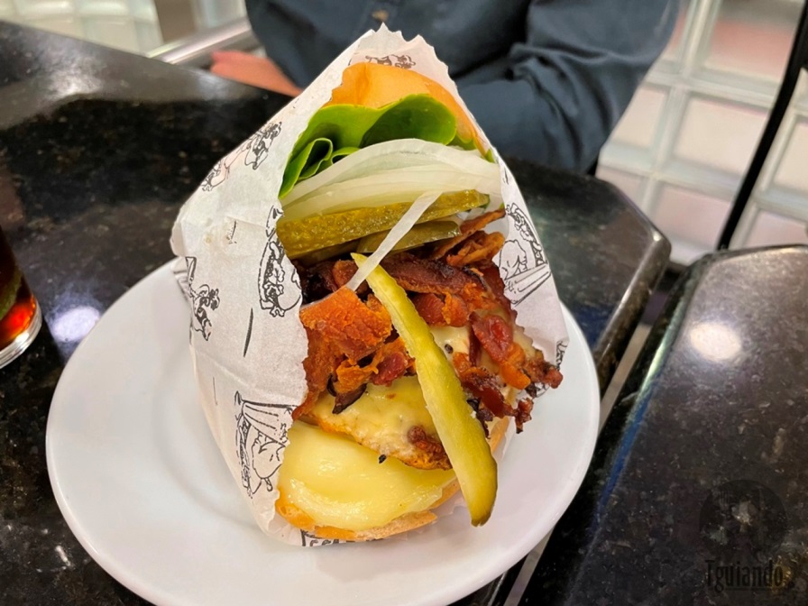 Estávamos em 4 pessoas e nossos pedidos foram: pico (a combinação do picles e da cebola crua sempre foi explorada nas lanchonetes mais tradicionais da cidade. Com a popularização da cultura do hambúrguer em SP, a combinação do picles, bacon e cebola roxa ganhou os brasileiros. A nossa versão não poderia deixar de acompanhar queijo e maionese à parte), R$ 47,70, BFT (o nosso frango empanado está há quase 20 anos agradando o paladar dos nossos amigos e clientes. Atendendo a pedidos, nesta versão, o frango empanado acompanha queijo, bacon, tomate e a nossa maionese), R$ 49,90, x-salada (a clássica combinação do hambúrguer tradicional, alface e tomate, com a exclusiva maionese Burdog), R$ 38,90, e ainda prato rápido (filé de frango com salada mista).
