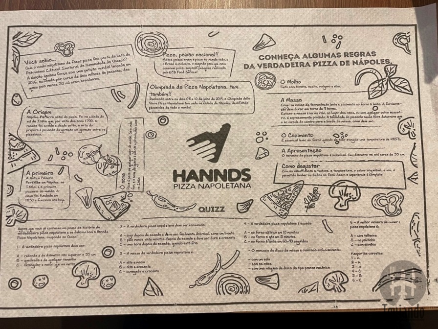 Na mesa, antes de servirem, é colocado um papel tipo jogo americano, com curiosidades sobre pizza e a pizzaria em si.
