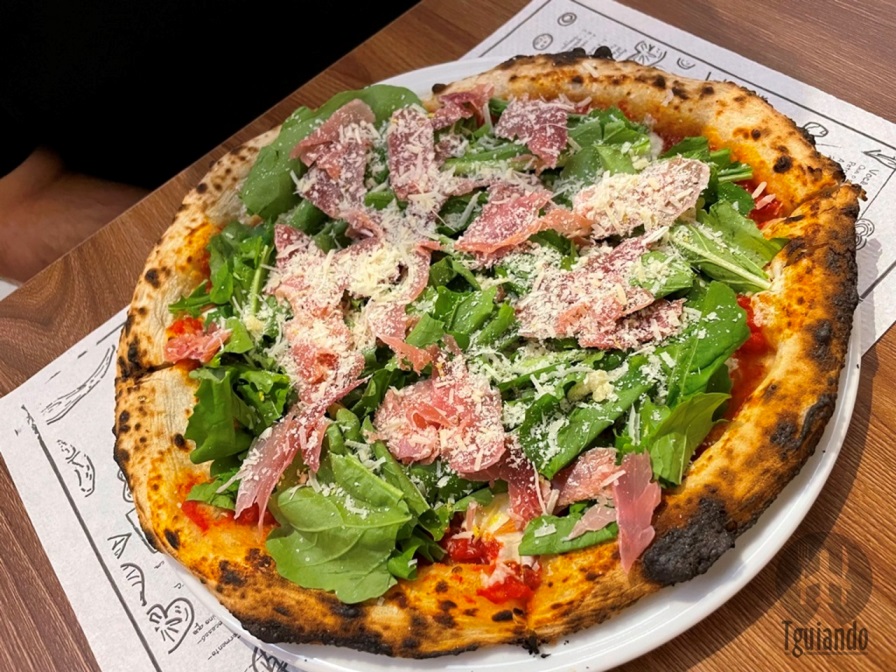 As opções no cardápio são bem legais e dos mais variados sabores, depois de ficar na dúvida, pedimos: caprese (molho de tomate pelado, muçarela, muçarela búfala, tomate cereja, pesto de azeitona preta e basilicão), R$ 55, e prosciuto crudo (presunto cru, molho de tomate pelado, muçarela de búfla, rúcula, parmesão e raspas de limão siciliano), R$ 50.