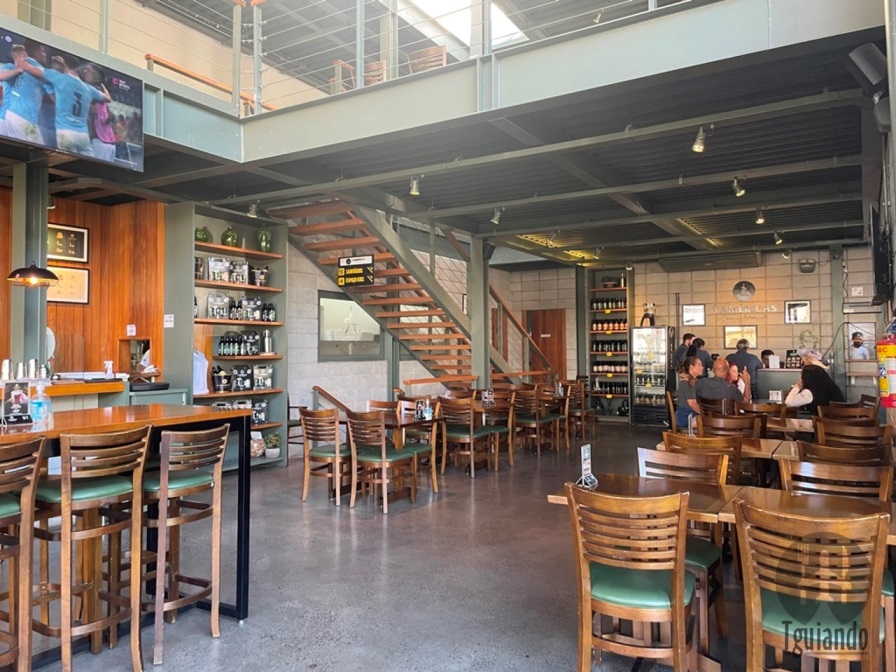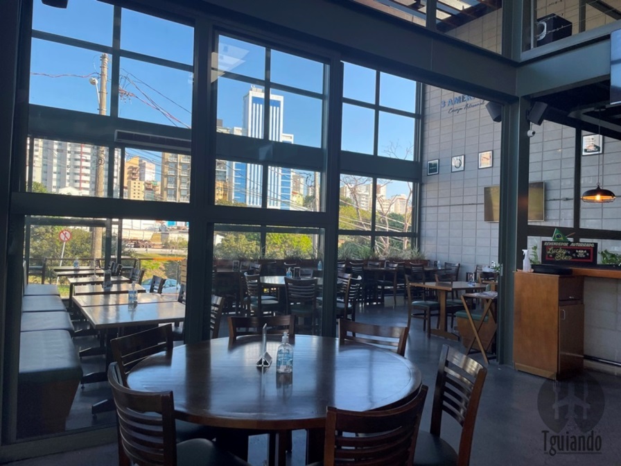 A cervejaria tem uns três ambientes: externo, com as mesinhas na calçada, interno perto do balcão e no deck, também interno ao lado do vidro.