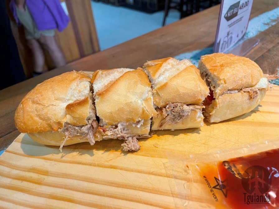 Pedimos ainda uma porção de linguiça caracol com provolone (400g, acompanha pão baguete, mostarda amarela e escura), R$ 42, e sanduiche pernil (pão baguete, pernil suíno desfiado temperado, queijo mussarela, tomate e cebola0, R$ 26.