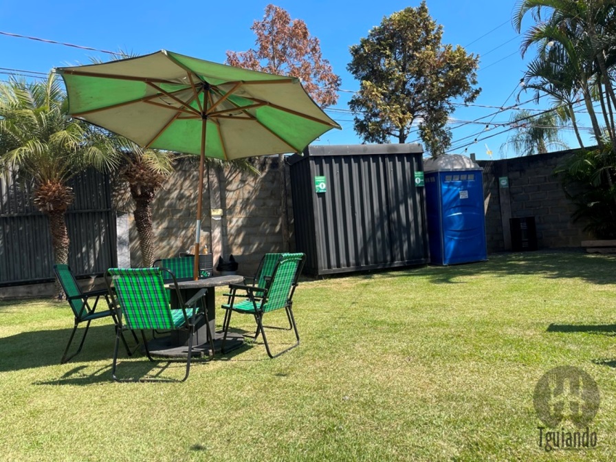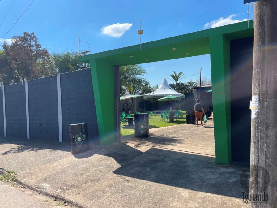 Logo na entrada, uma kombi estilizada, guarda-sol e cadeiras de praia num grande gramado e, ao fundo, uma área coberta, com as torneiras de chopp e palco para músicos.