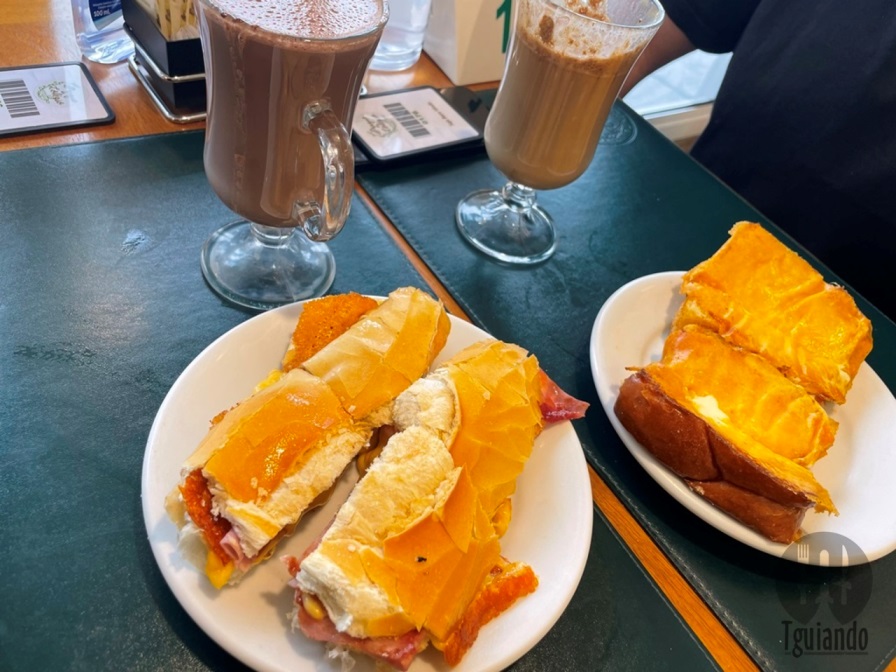 Nosso café da manhã em padaria é praticamente o mesmo de sempre: chocolate quente, R$ 11, e cappuccino, R$ 11,50, misto quente, R$ 25, e pão com requeijão na chapa, R$ 12.