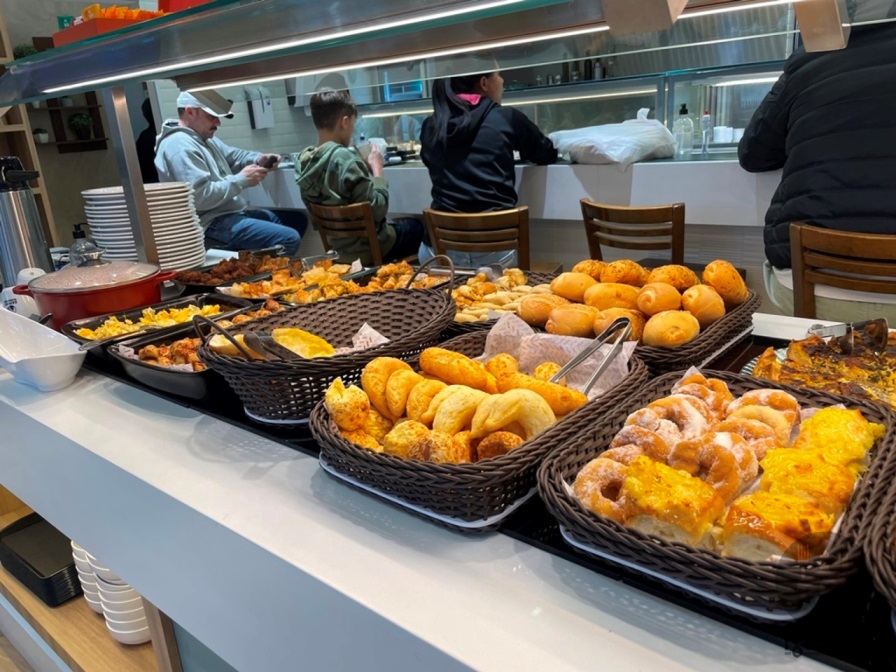 Além do itens do balcão, tem os do cardápio ou ainda pelo buffet, além de almoço, caldos e pizzas dependendo da época do ano.