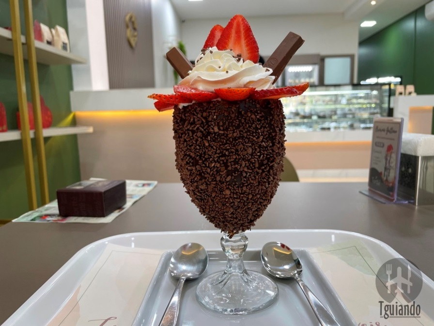 Pedimos ainda a taça gourmet de brigadeiro com morango (450ml de sorvete de chocolate com especiarias, brigadeiro belga 50% cacau, pedaços de morango, chantininho branco e granulado callebaut, com 2 kit kat ao leite por cima), R$ 52.