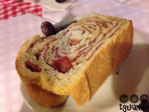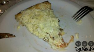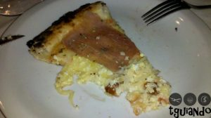 Detalhe, a fatia é bem servida e acompanha azeitona preta.