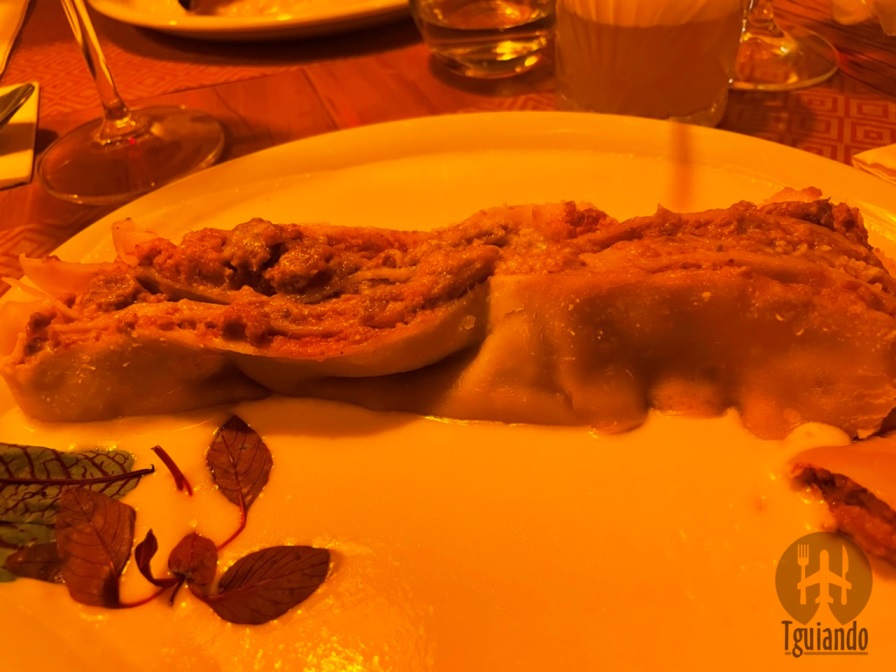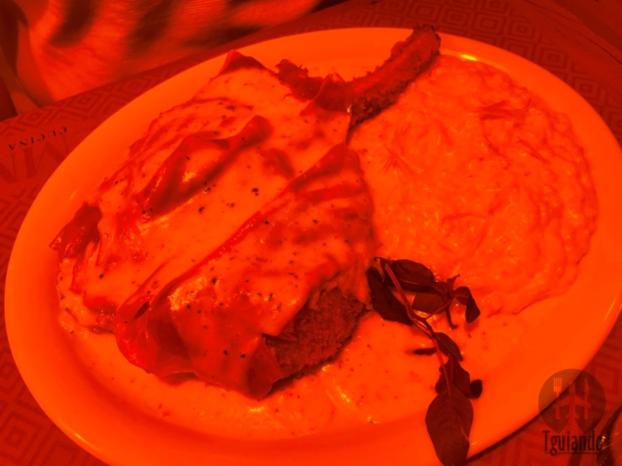 Os pratos principais que escolhemos foram: lasagne alla bolognese (massa fresca da casa, molho bechamel, parmesão e clássico ragu bolognese, servido com creme de ueijo pecorino), R$ 69, e cotoletta di maiale (prime rib suíno empanado e frito, finalizado no forno com creme de parmesão e salsa de trufas negras, acompanha mix de folhas), R$ 89.