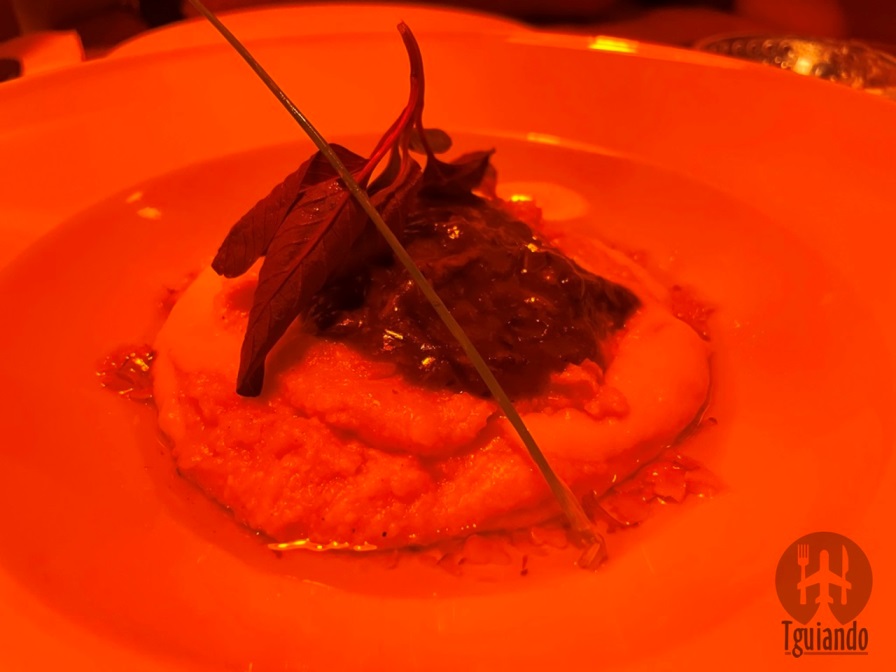 Começamos com gold & apple sour (drink com whisky Jonnie Walker, suco de maçã, xarope de limão siciliano, proteína e finalizado com lâminas de maçã verde, clássico sabor sour, equilíbrio entre doce da maçã e o sabor encorpado do whisky), R$ 35, e polenta com ragu (polenta italiana cremosa com fonduta de queijos, ragu genovés e um toque de nozes), R$ 37.