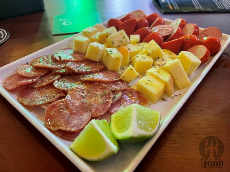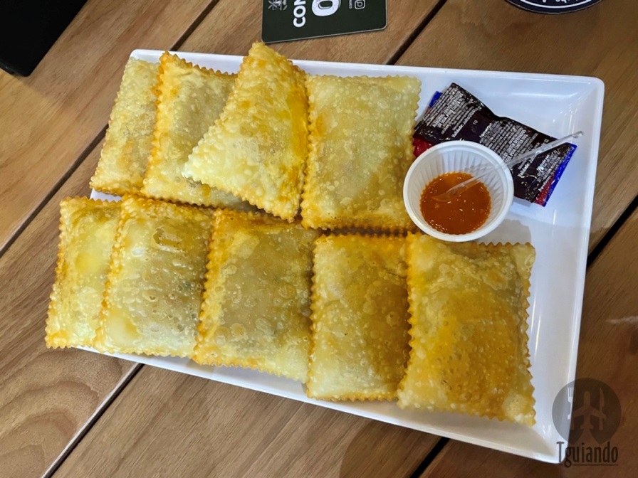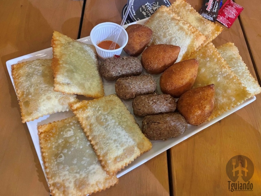 As porções que provamos foram: pastelzinho de pernil (recheio caprichado de pernil desfiado e catupiry), tábua de frios da casa (350g, salaminho, copa, queijo minas e provolone temperados com orégano e azeite e salsicha à vinagrete, acompanha limão), coxinha sem massa catupiry com frango (6 unidades, acompanha molho de pimenta da casa e ketchup), e porção atrevida (16 unidades, podendo escolher 4 unidades de cada de pastéis e bolinhos, acompanha molho de pimenta da casa, ketchup e barbecue, optamos por: pastelzinho de queijo com manjericão, quibe com queijo, coxinha de cabotiá com carne seca e pastelzinho de carne com gorgonzola).