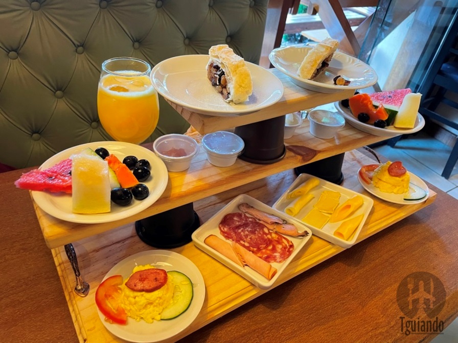 Nesse café, está incluso: seleção de pães (alemães e francês, croissant e pão de queijo), ovos mexidos, frios (salame, peito de frango, presunto), salsichão alemão, tomate, pepino, queijos (mussarela, brie e prato), seleção de frutas frescas, granola, geleia artesanal alemã, requeijão, manteiga, bebidas (suco, leite, café, capuccino, machiatto, chocolate quente) e strudel de maçã.
