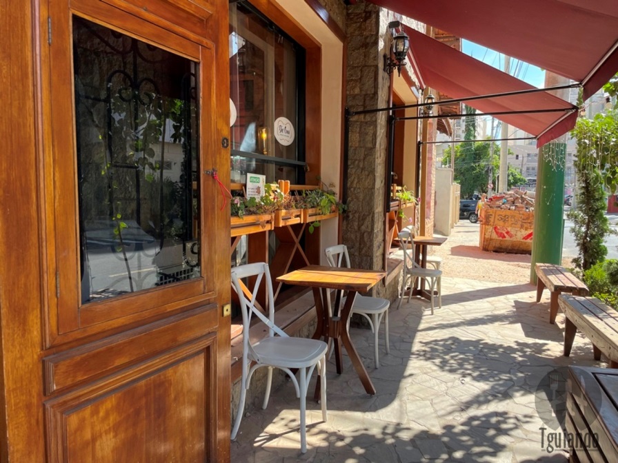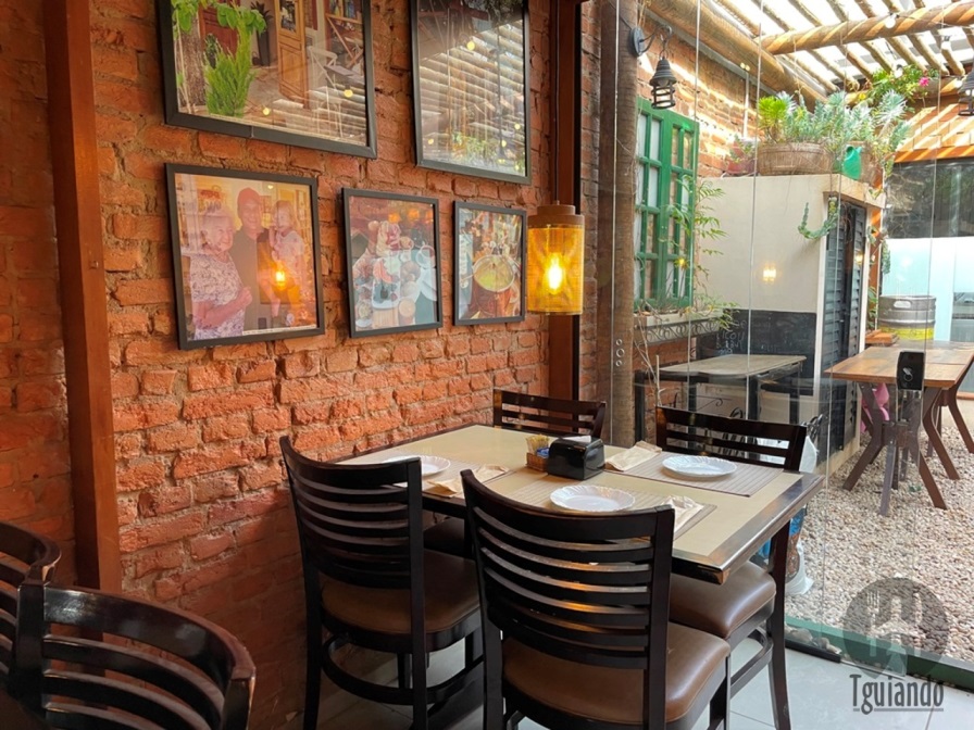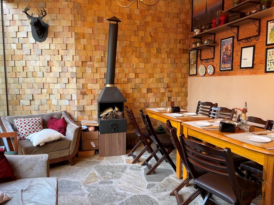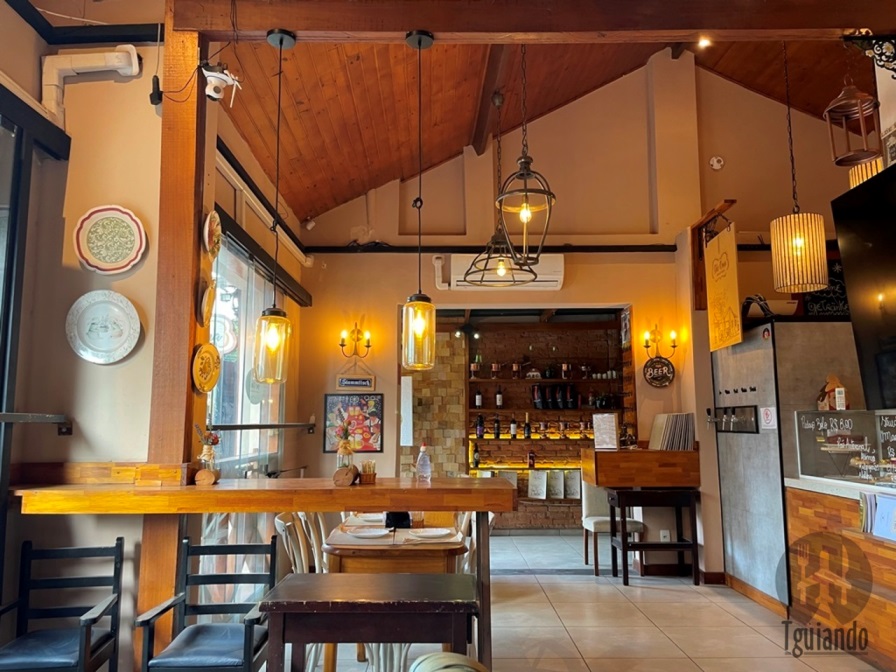 Uma linda casinha de pedra, com toldo vermelho e uma árvore cobrem as mesinhas na calçada, ao entrar, algumas no corredor lateral que leva até outras no fundo, em um ambiente todo aconchegante com sofá e lareira.
